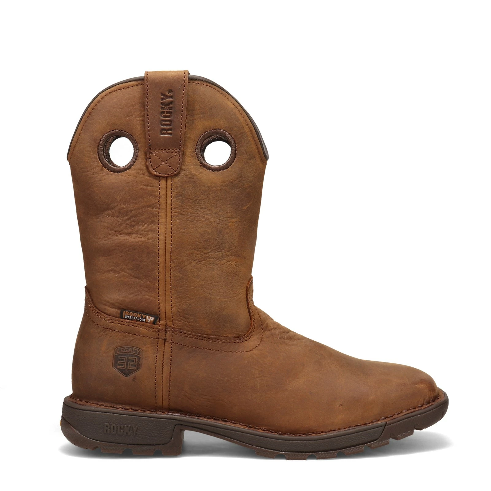 Men’s Rocky, Legacy 32 Waterproof Steel Toe Western Boot. Rocky’s Legacy 32 waterproof work boots deliver superior comfort, performance and safety all in a rugged wellington boot style. These premium quality work boots have a water proof full grain leather upper with proprietary Vibram rubber outsole and an EVA midsole with fiberglass shank.