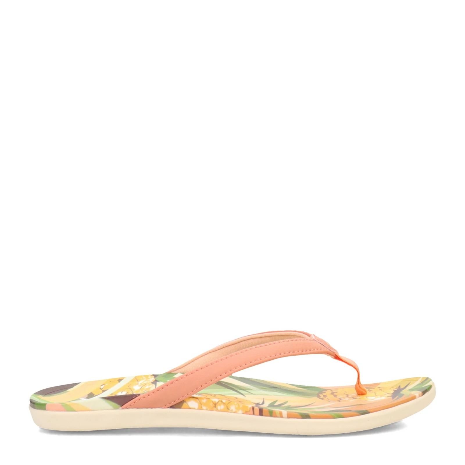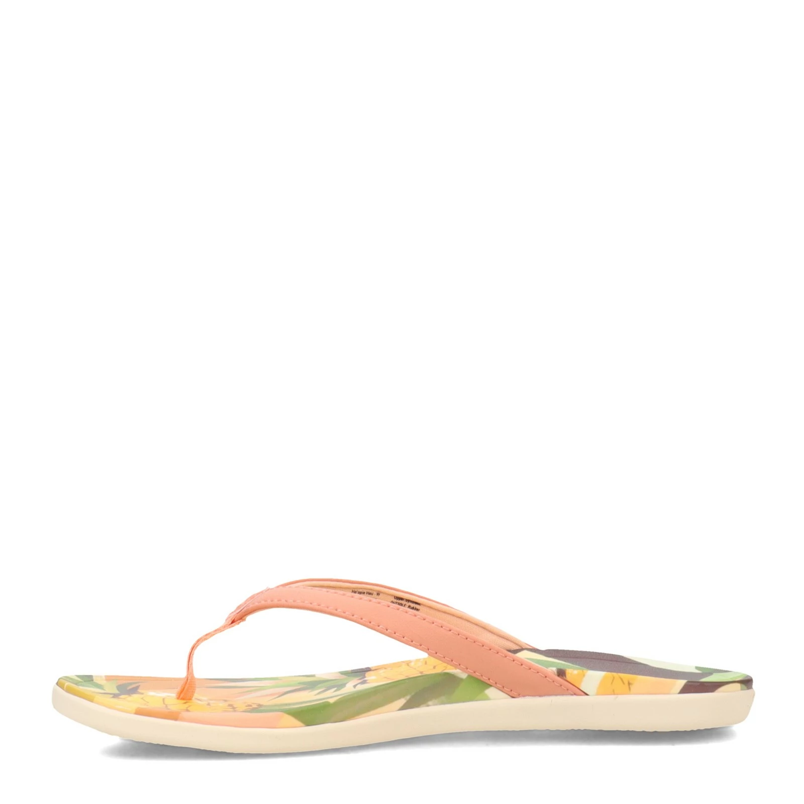 Women’s OluKai, Ho’opio Hau Sandal. This lightweight thong sandal features water-resistant synthetic straps, a soft nylon toe post, and tropical inspired print art on the footbed. The PU footbed provides anatomical support, while the wave print traction pods provide enhanced grip. Perfect for walking around town or wearing as a casual beach shoe.